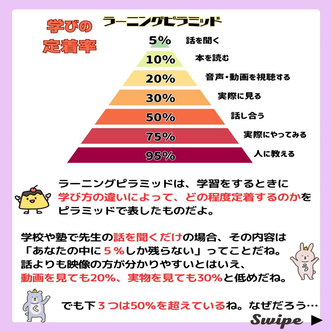 それを自分で使いこなそうとするアウトプットをすることにより、学びの定着率がぐんとあがるということです!