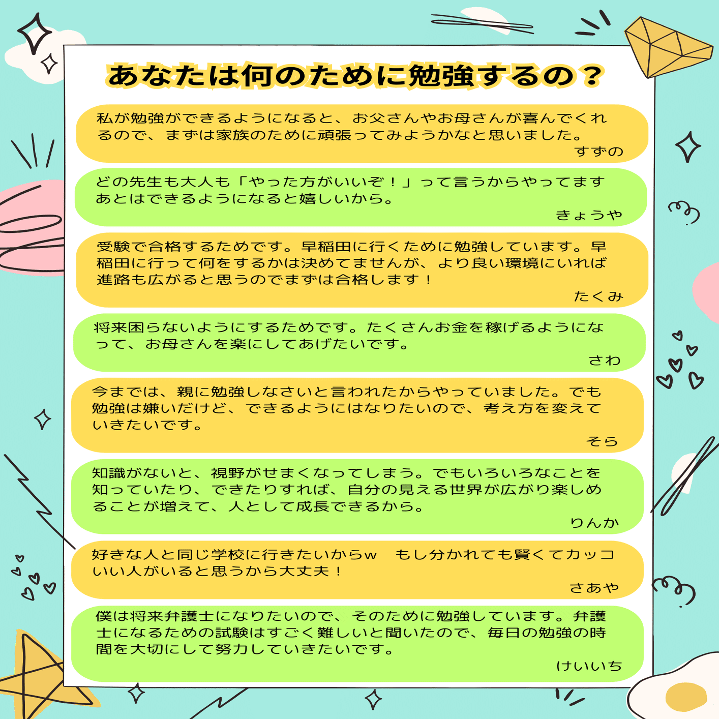 ここまで対話をすると、子供も自分の言葉で、何のために勉強するのかいえるようになってきます。